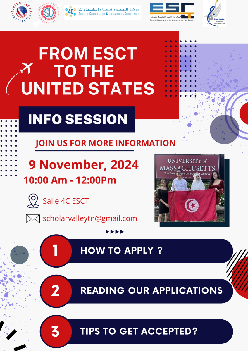 Le bureau 4C-ESCT organise ce samedi le 09 Novembre 2024 de 10h à 12h à la Salle 4C ESCTune session d’information spéciale où vous rencontrerez des étudiants qui ont déjà participé à ce programme  La session sera animée par Samar Khelifi représentante ESCT au programme été 2024 et Dorra Dhibi représentante de l'INSAT