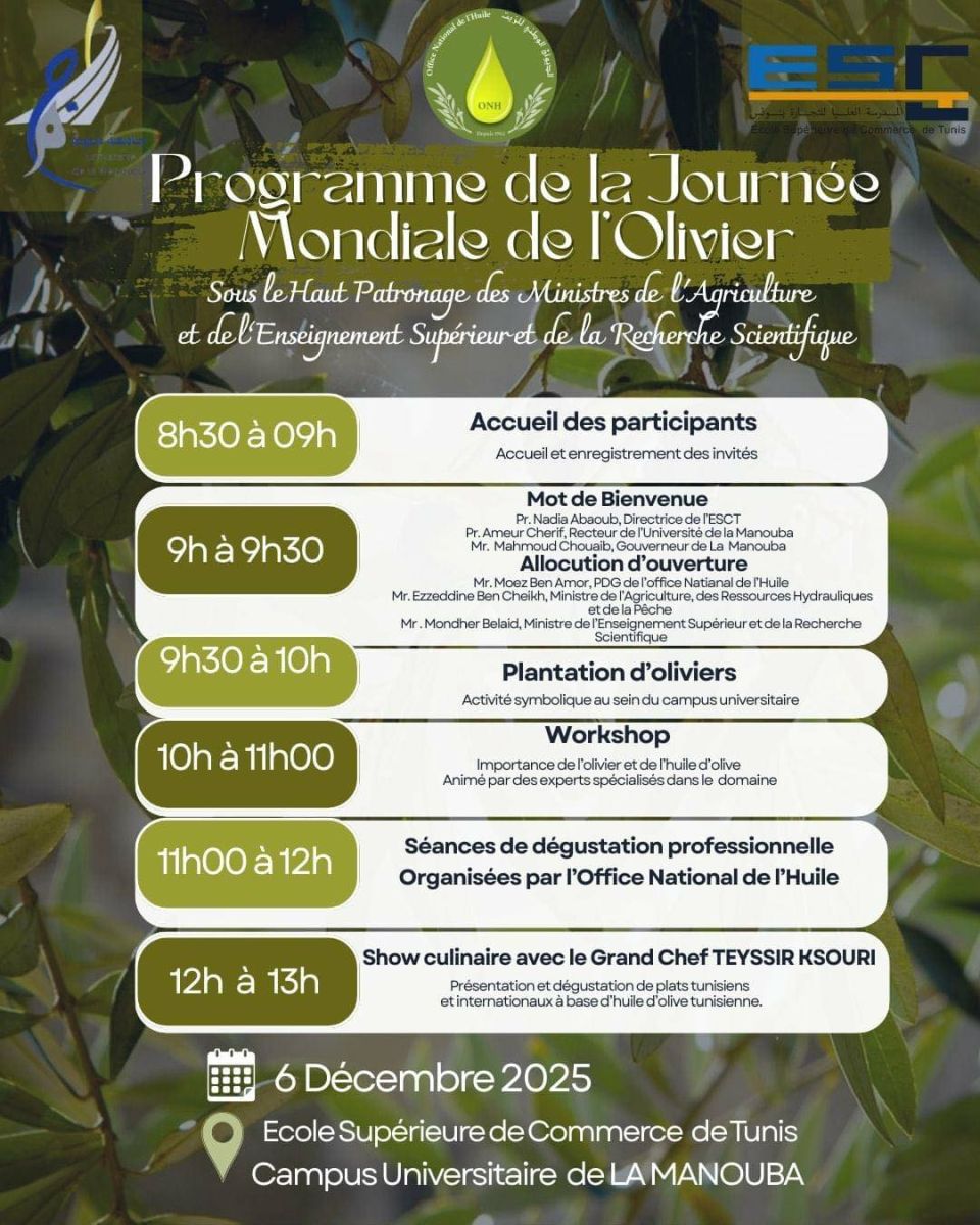 Cette journée, organisée en collaboration avec l’Office National de l’Huile, mettra à l’honneur l’olivier et l’huile d’olive, piliers du patrimoine économique, culturel et environnemental tunisien, et réunira des personnalités académiques et institutionnelles de premier plan.