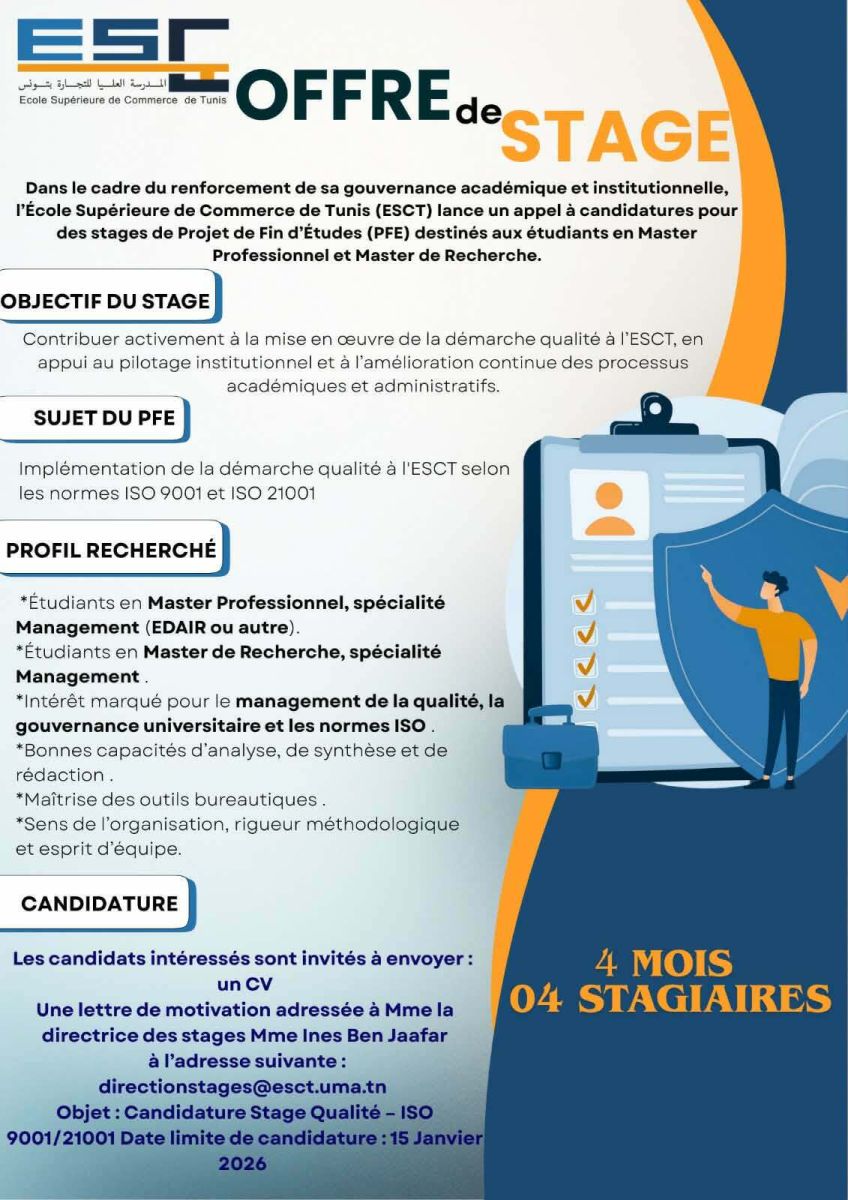 Candidature : CV + LM adressés à Mme Ines Ben Jaafar via directionstages@esct.uma.tn.