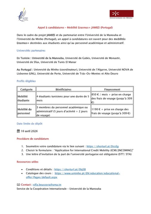 APPEL A CANDIDATURE MOBILITE ERASMUS + UMA - JAMIE'S